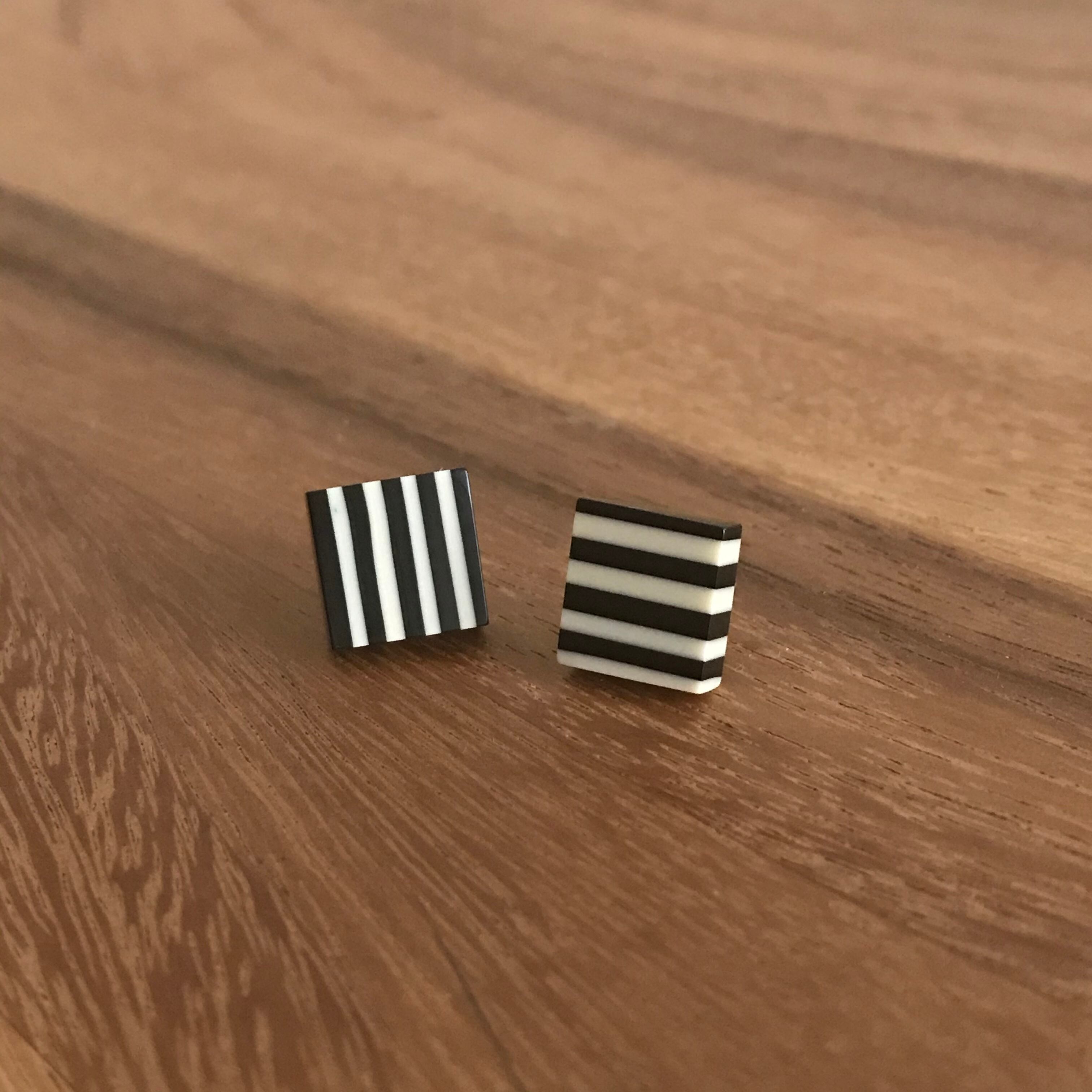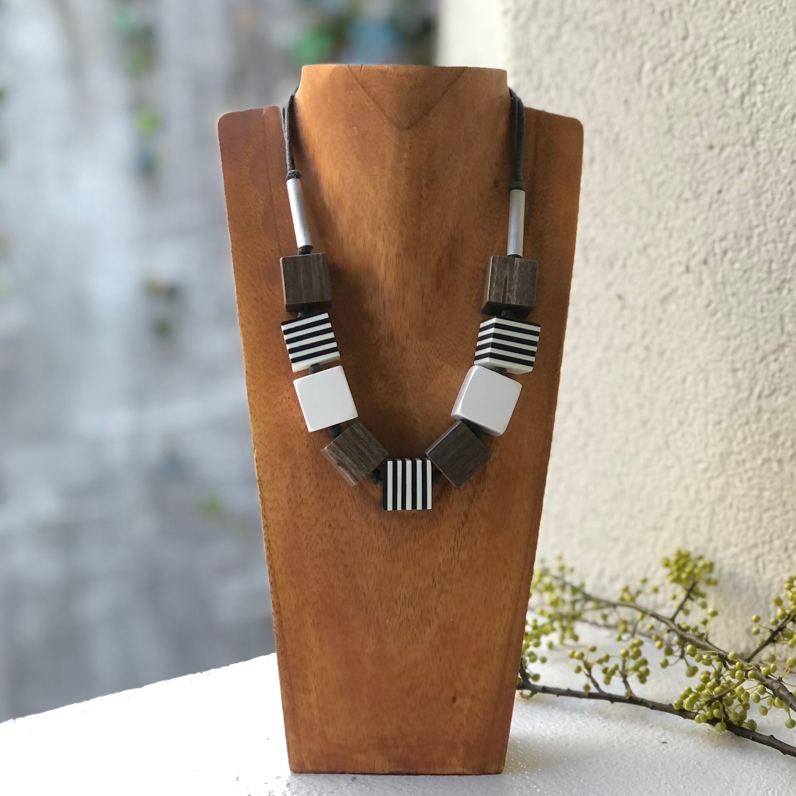 コロコロしたキューブ型の2色の木とストライプのレジンの連続が目を引くネックレス。見た目より軽く(約70g)シンプルなTシャツやセーターなどベーシックな洋服にもほどよいアクセントをプラスしてくれます。ILLUMINA STYLEのストライプピアスとも相性ぴったりです。
