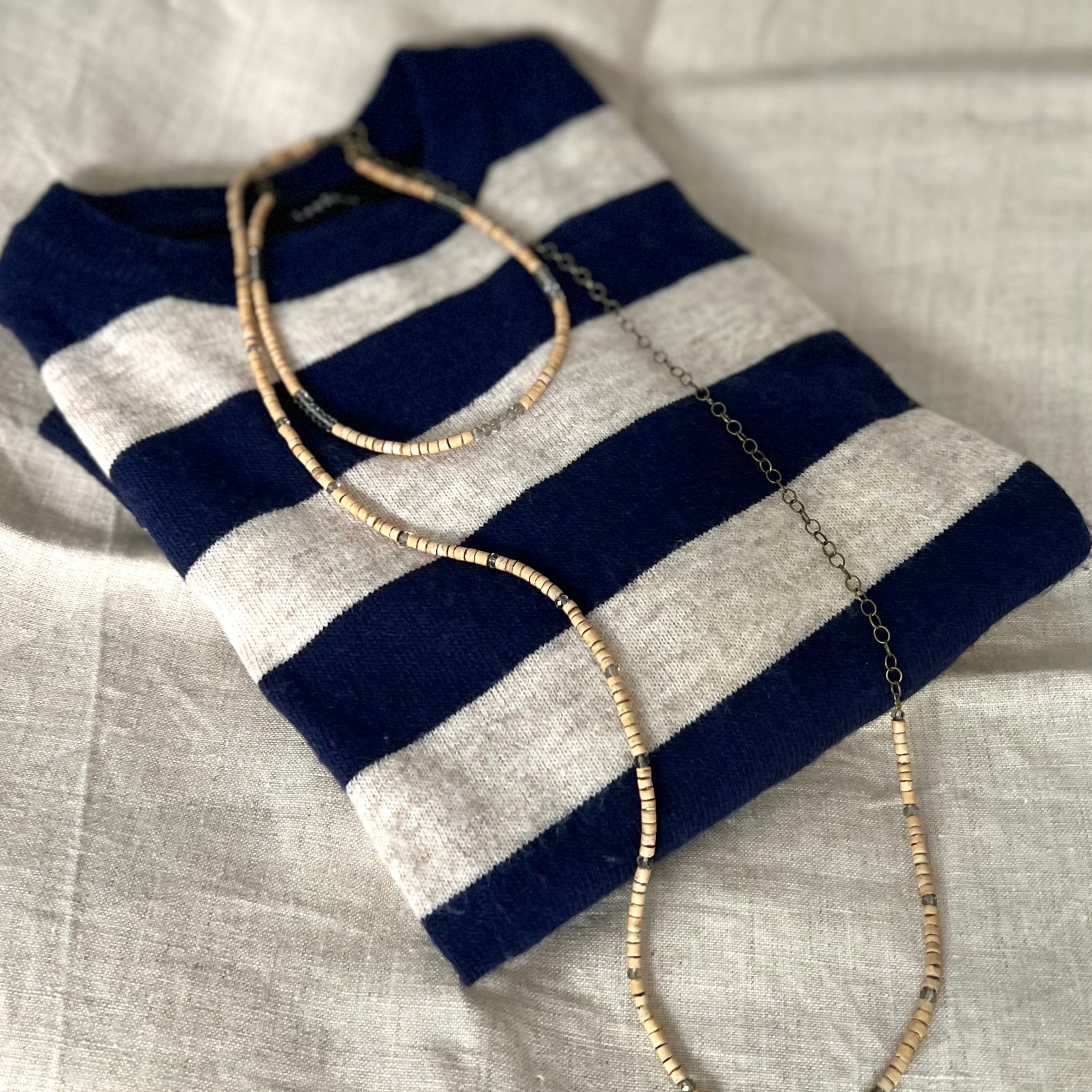 ナチュラルなウッドビーズとガラスビーズにチェーンを組み合わせたロングネックレス。留め具のないネックレスですので、洋服やシーンに合わせて見せ方も自由です。夏の装いにぴったりなのはもちろんのこと、カジュアルな薄手のセーターなどに合わせても軽やかな女性らしい雰囲気をプラスしてくれるアイテムです。他のBOHOシリーズのネックレスやお手持ちのアクセサリーとの重ねづけも素敵です。