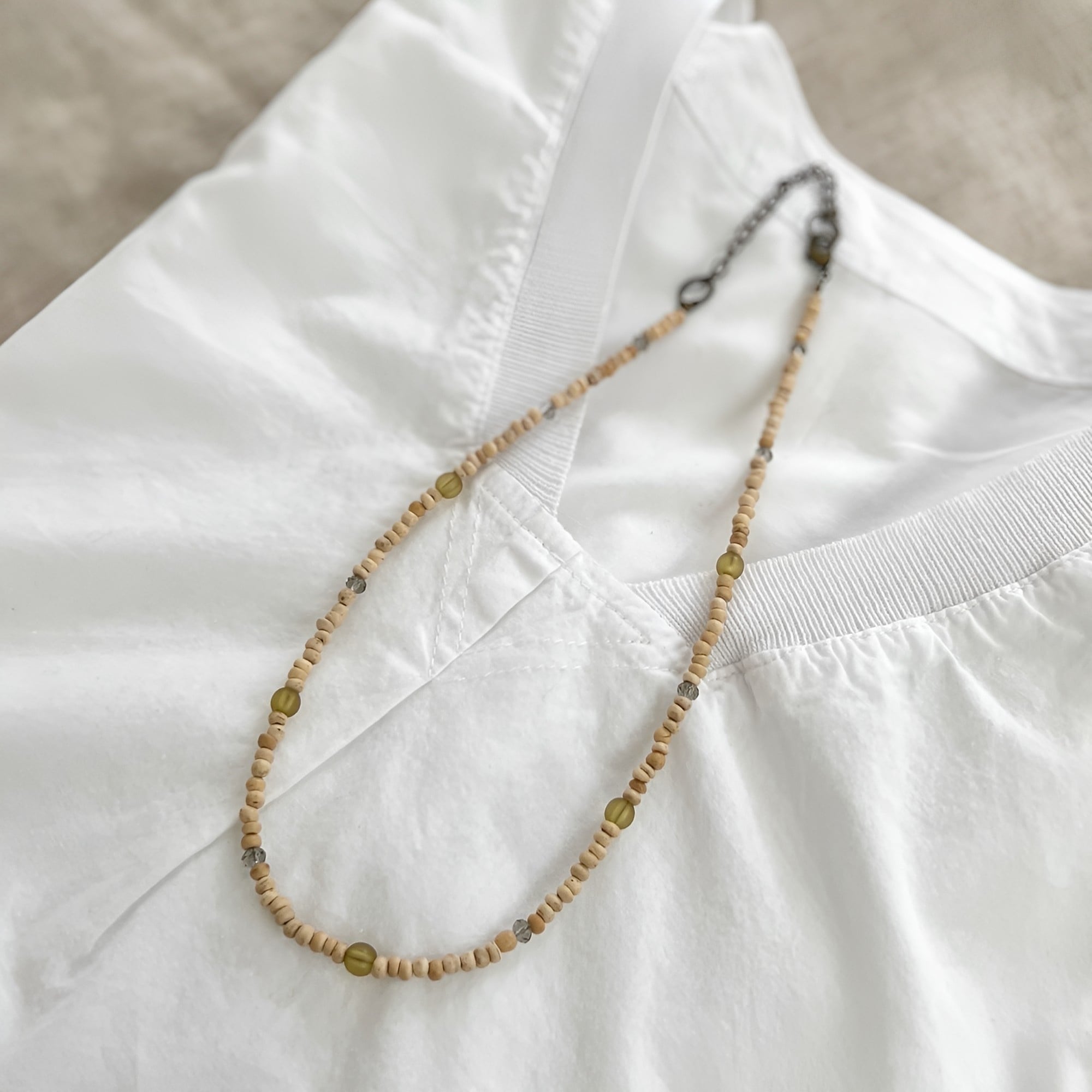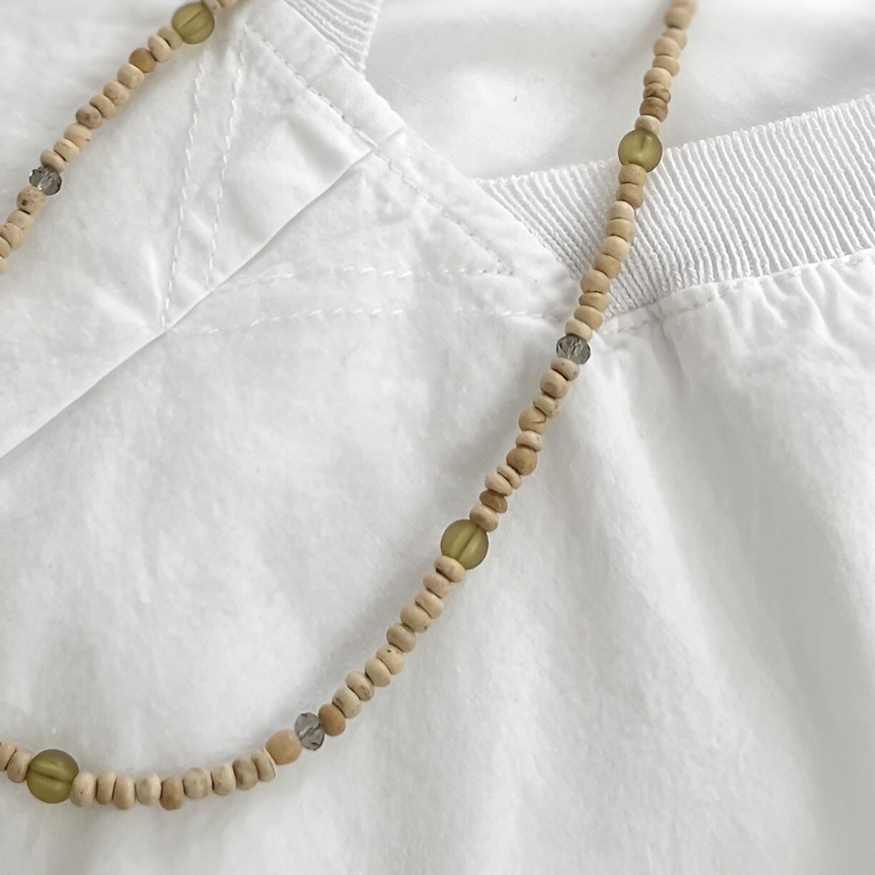 ナチュラルなウッドビーズと落ち着いたグリーン系やグレー系のガラスビーズのコンビネーションがかわいいショートネックレス。他のBOHOシリーズのネックレスやお手持ちのアクセサリーとの重ねづけも素敵です。