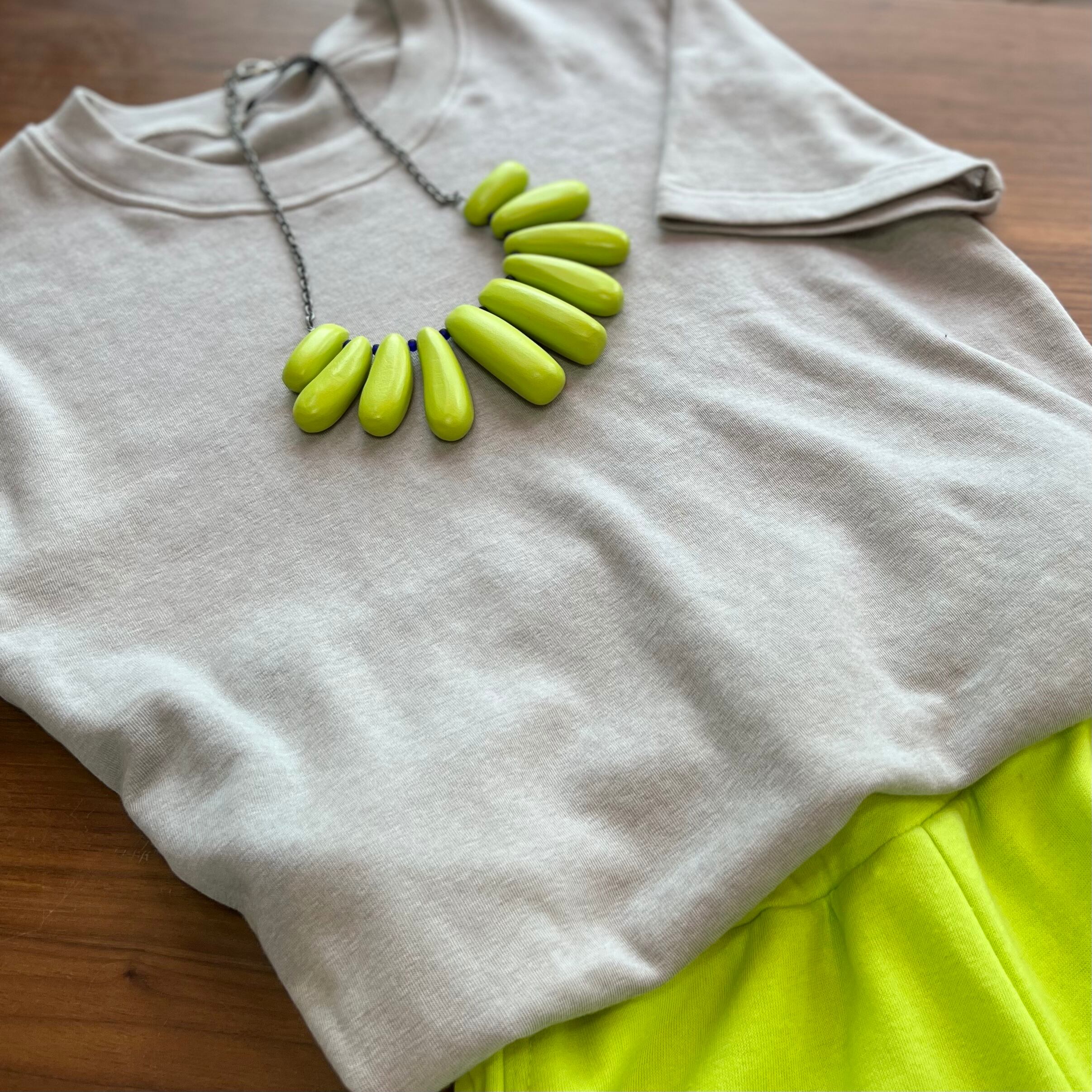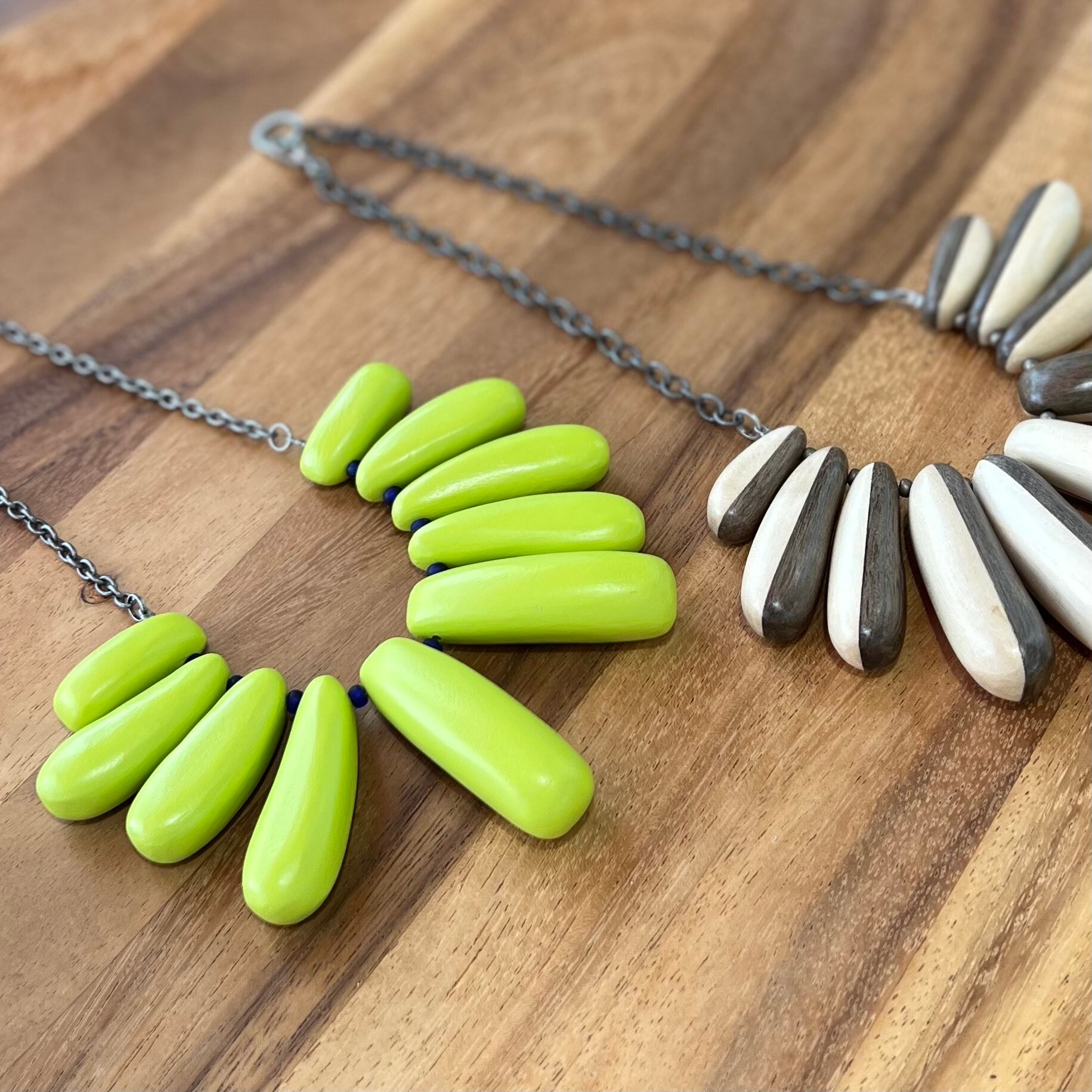 元気が出る明るいグリーンカラーのウッドとネイビーのガラスビーズのネックレス。装いにアクセントを加えたい時にぴったりです。