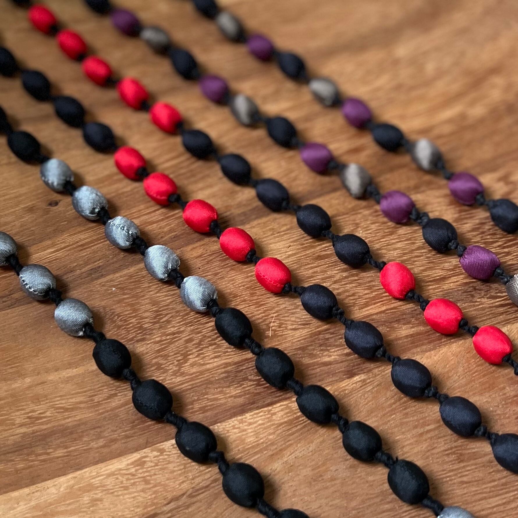 カンボジアの女性や女の子達の自立を支援するNPO団体が制作するシルクのネックレス。美しいシルクの発色とカンボジアの女性達の丁寧な手仕事から生み出されたネックレスは着けるだけで元気になれます。軽いことも皆様に喜ばれています。